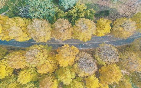 11月2日,市民在河南省焦作市温县子夏公园休闲健身(无人机照片)。深秋时节,景色绚烂,全国多地迎来赏秋热潮。