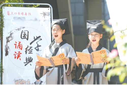 图④ “小书虫”在参加市图书馆的经典诵读活动。
