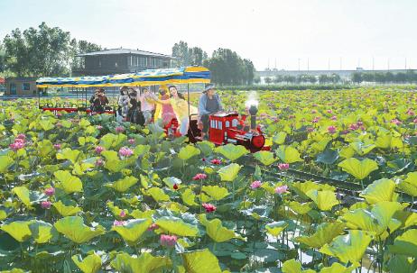 7月8日,游客在焦作市武陟县大虹桥乡黄河滩区的黄河龙泽园坐着游览小火车观赏荷花。该园区位于黄河旅游带之上,占地1500余亩,种植各类荷花400多种,已成为当地乡村旅游热门地,促进了乡村“赏花经济”发展。
