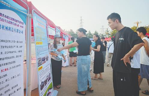8月1日下午,在中站区许衡广场,求职者仔细查看招聘信息。当日,2025年焦作市联合招聘高校毕业生暨百日千万招聘专项行动中站区站活动在许衡广场举行,52家企业为广大求职者提供了972个就业岗位。