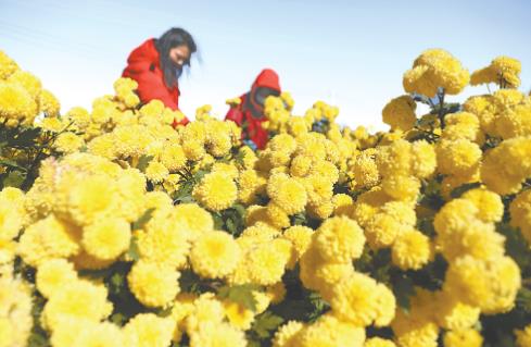 11月18日,河南省焦作市温县黄河街道下石井村一家怀药种植专业合作社员工在采收怀菊花。时下,各地农民抢抓农时,加紧开展采收、晾晒、销售等工作,一片繁忙景象。