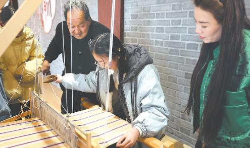 3月2日,马村区武王街道王母泉村老粗布非遗工坊迎来首批研学团队。在村里非遗老粗布制作技艺传承人王和平(右三)的引导下,同学们饶有兴趣地操作织布机,感受指尖非遗的魅力。