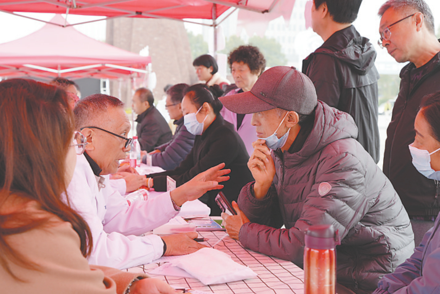 图③ 焦作市第二届“中医药文化周”活动现场,参加义诊的中医专家为市民把脉问诊。