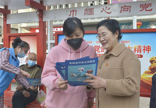 山阳区艺新街道冬香好妈妈工作站党支部书记张冬香和志愿者们在向社区居民宣传二十大精神。