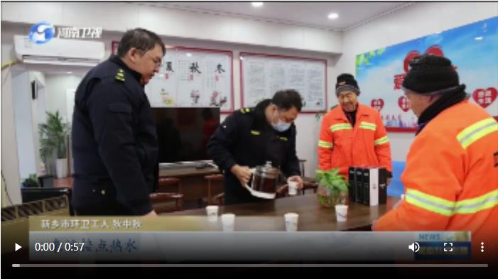 新乡市环卫工人 狄中秋:这段时间天气比较冷,来这接点热水,中午还能来这热一下饭,吃口热乎的,坐这休息休息,挺舒服的。