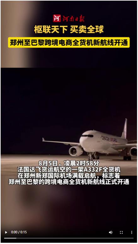 8月5日,凌晨2时58分,夜色中,法国达飞货运航空的一架A332F全货机在郑州新郑国际机场满载启航,标志着郑州至巴黎的跨境电商全货机新航线正式开通。