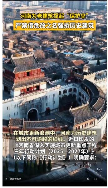 在城市更新浪潮中,河南为历史建筑划出不可逾越的红线。近日印发的《河南省深入实施城市更新重点工程三年行动计划(2025—2027年)》(以下简称《行动计划》)明确要求:严禁以危险住房改造名义违法违规拆除改造历史文化街区、传统村落、文物和历史建筑。《行动计划》)还明确提出了一系列具体措施,以确保历史建筑在城市更新过程中得到应有的尊重和保留。