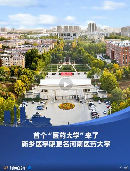 经教育部批复,新乡医学院即日起正式更名为河南医药大学,这也是我国医学高等教育领域首个以“医药大学”命名的高等院校。