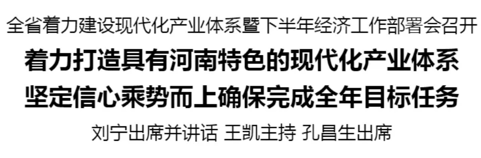 7月23日,全省着力建设现代化产业体系暨下半年经济工作部署会在郑州召开,学习贯彻习近平经济思想和习近平总书记在河南考察时重要讲话精神,全面落实省委十一届九次全会部署,动员全省上下聚焦“两高四着力”,坚定沿着高质量发展这条最优曲线、最佳路径迈进,确保完成全年各项目标任务、顺利实现“十四五”收官。省委书记刘宁出席并讲话,省长王凯主持,省政协主席孔昌生出席。