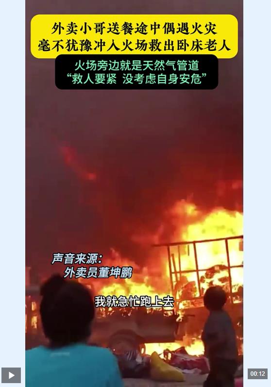 近日,河南郑州一位外卖小哥在送餐途中偶遇小区火灾,毫不犹豫地冲进火场,成功背出一位卧床老人,他背负老人离开火场的视频,感动了无数网友,收获了满屏点赞与深深敬佩。