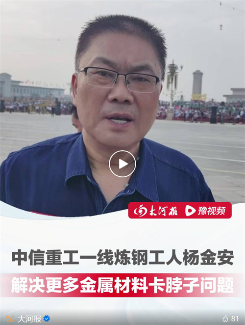 在现场观礼的人群中,一位来自河南的产业工人,身着工装、胸佩奖章,心情无比激动,他就是全国劳模、大国工匠、中信重工铸锻公司冶炼车间电炉班班长杨金安。