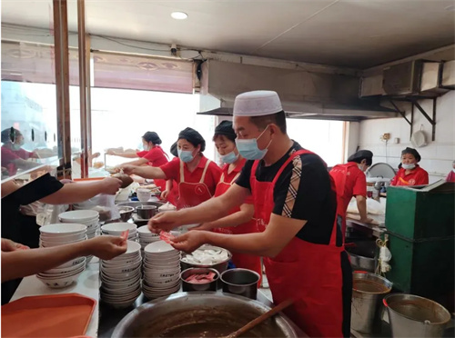 河南省漯河市北舞渡镇一家胡辣汤店里,店员正在给顾客服务。