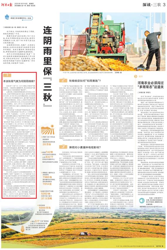 2025年“三秋”(9—10月)期间,河南天气格外反常,一场场雨水接踵而至,将本该秋高气爽的季节变成了阴雨绵绵的“梅雨季”。
