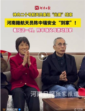 今天,神舟二十号航天员乘组,乘坐神舟二十一号载人飞船返回地球。刚刚,神舟二十一号载人飞船返回舱在东风着陆场成功着陆。