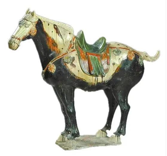唐三彩是盛行于唐代的一种低温彩釉陶器。它不止3种颜色,所谓“三彩”是多彩之义。除常见的黄、绿、白,还包括褐、蓝、紫等釉色。由于当时的釉料中并未包含黑色,匠人需反复施釉方能偶然在窑火中淬炼出深邃的黑色。这尊三彩黑釉马的珍贵,正在于这“偶然”中的“必然”。