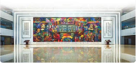一入大门,气势恢宏的巨型三彩环艺壁画《洛阳》便映入眼帘,它出自中国工艺美术大师郭爱和之手,打破了人们对传统三彩的固有认知。壁画中,“五都荟洛”“五路通洛”“五水融洛”“五业兴洛”等元素,生动诠释了洛阳厚重的历史文化与充满希望的未来愿景。
