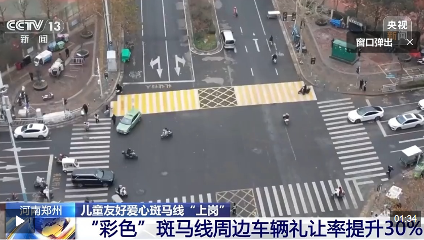 近日,在河南郑州,64条设计精巧、充满童趣的“儿童友好爱心斑马线”在郑州各中小学、幼儿园周边陆续亮相。这些斑马线告别单调的黑白条纹,换上明艳的彩色新装,从儿童视角出发优化视觉效果,设置以来,车辆礼让率较之前提升了30%。