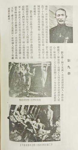 在刘九学的事迹介绍中这样写道:“刘九学,男,45岁,平原省博爱县人,焦作煤矿矿工。解放前,煤矿工人的生命从来没有人关心。解放后,工人阶级翻了身,安全生产才被提到头等重要的地位。由于党政工团的教育与策励,刘九学班创造了19个月无伤亡事故的安全纪录,受到了全国煤矿管理总局的奖励,称他们那个班为安全生产模范班。刘九学同志接受了过去工作中血的教训,深深体会到安全工作对工人的重要。因而他经常提醒工友们对安全工作的注意。耐心说服与教育,使全班工友们对安全工作都有深切的认识。并能及时的表扬与批评,改造本班思想落后的工友,建立了分工负责制,使每个人都有了明确的责任范围。”
