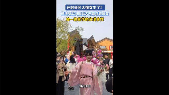 3月24日,“开局之年看中国·原来你是这样的河南”网络主题宣传活动“智绘文脉焕新彩”线路采风团走进清明上河园,逛了一把“大宋花市”。