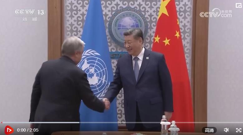 当地时间7月4日下午,国家主席习近平在阿斯塔纳出席上海合作组织峰会期间会见联合国秘书长古特雷斯。