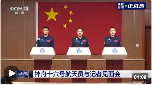 今天(29日)11时,景海鹏、朱杨柱、桂海潮3名航天员在酒泉卫星发射中心问天阁与中外媒体记者集体见面。