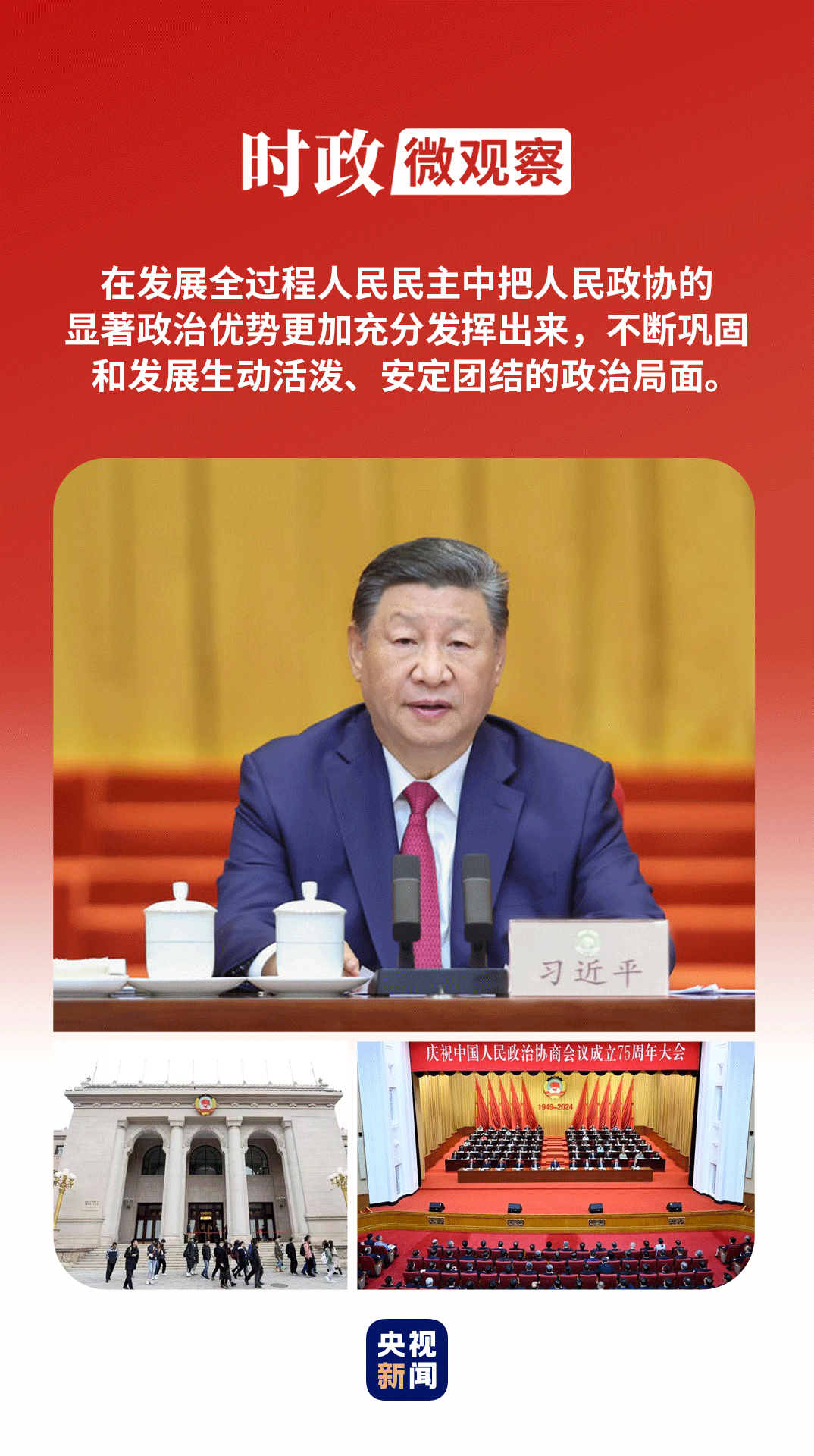 在庆祝大会上,习近平总书记强调:“我们要更加坚定道路自信、理论自信、制度自信、文化自信,在发展全过程人民民主中把人民政协的显著政治优势更加充分发挥出来,不断巩固和发展生动活泼、安定团结的政治局面。”