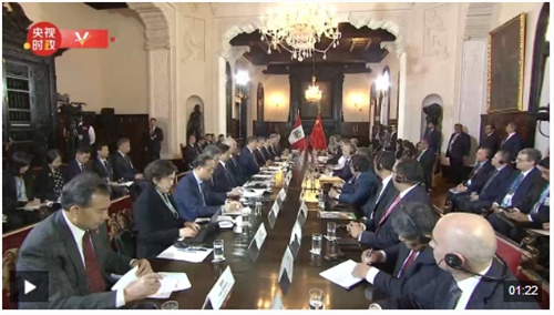 当地时间11月14日下午,国家主席习近平在利马总统府同秘鲁总统博鲁阿尔特举行会谈。