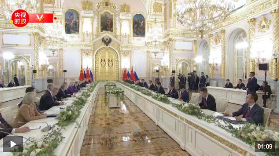 当地时间5月8日上午,俄罗斯总统普京同中国国家主席习近平在莫斯科克里姆林宫举行会谈。