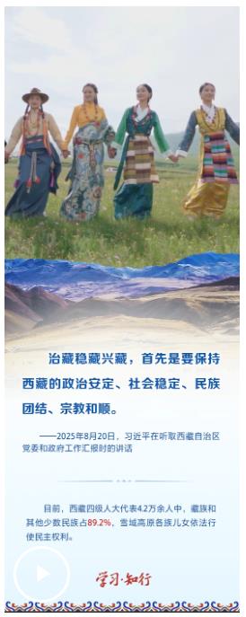 2025年8月20日,习近平总书记率中央代表团乘专机抵达拉萨,出席西藏自治区成立60周年庆祝活动。在听取西藏自治区党委和政府工作汇报时,习近平总书记强调,“持续深入抓好稳定、发展、生态、强边四件大事,努力建设团结富裕文明和谐美丽的社会主义现代化新西藏”。