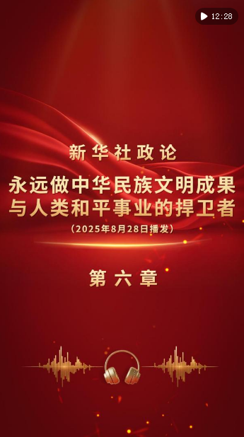 新华社8月28日播发《新华社政论|永远做中华民族文明成果与人类和平事业的捍卫者——写在中国人民抗日战争暨世界反法西斯战争胜利80周年之际》。我们邀请诵读嘉宾刘劲演播“第六章”。