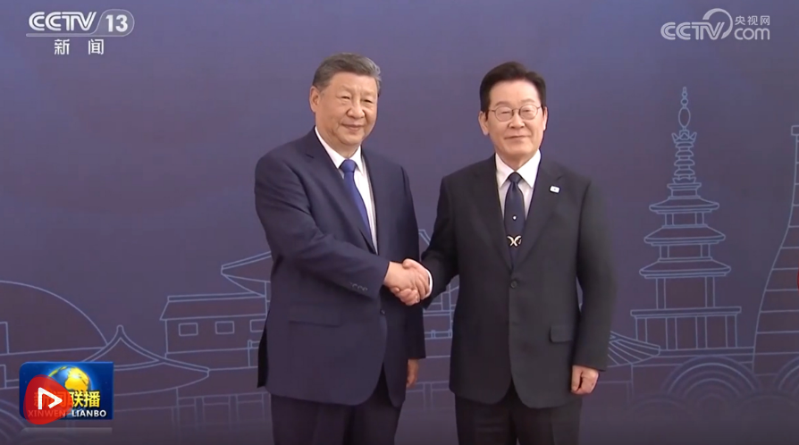 李在明热情迎接习近平。两国元首握手合影。