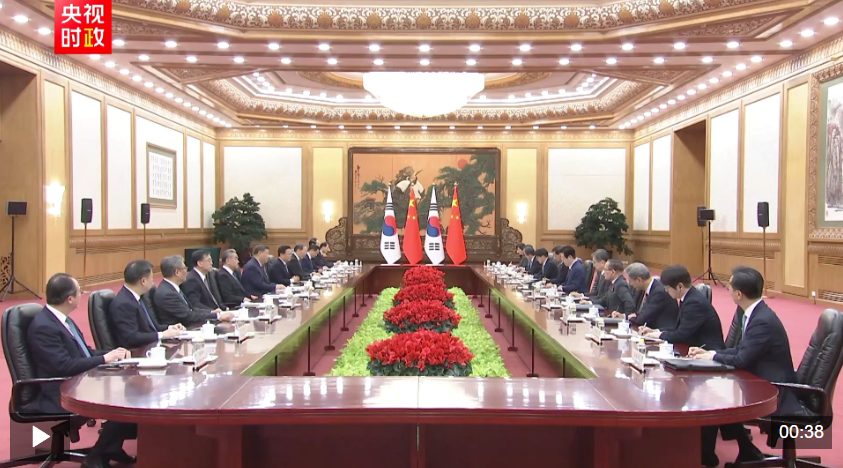习近平指出,当前世界百年变局加速演进,国际形势更加变乱交织。中韩在维护地区和平、促进全球发展方面肩负重要责任,有广泛利益交集,应当坚定站在历史正确一边,作出正确战略选择。