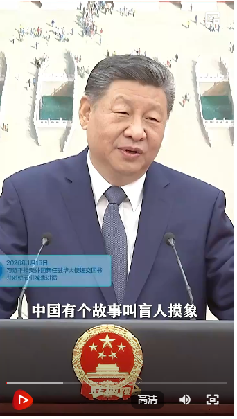 仪式结束后,习主席在对使节们发表讲话时,讲到一则“盲人摸象”的寓言故事。习主席说:“象很大,如果是一个盲人,他摸到一条腿,就说象是一个柱子,摸到肚子,就说象是一堵墙,但实际上不是完整的象。”