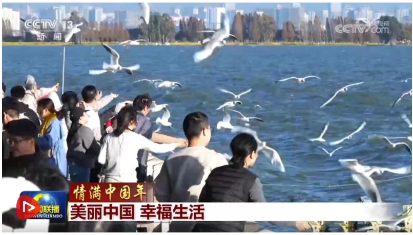 春节假期,云南昆明滇池沙鸥翔集、碧波荡漾,在紧邻滇池的福保社区,人们跳起民族舞蹈,喜迎八方来客,共赏滇池生态美景。