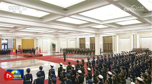会谈前,习近平和夫人彭丽媛在人民大会堂北大厅为扎帕罗夫和夫人扎帕罗娃举行欢迎仪式。