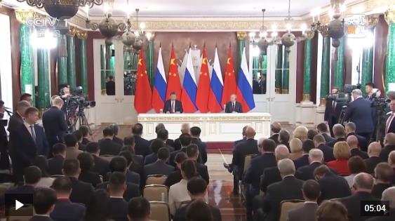 当地时间5月8日中午,国家主席习近平同俄罗斯总统普京在莫斯科克里姆林宫会谈后共同会见记者。