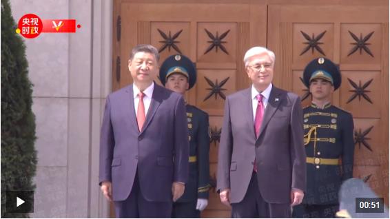习近平抵达阿斯塔纳纳扎尔巴耶夫国际机场时,托卡耶夫总统率总统办公厅主任达杰拜、副总理兼外长努尔特列乌、总统外事顾问卡济汉、阿斯塔纳市长卡瑟姆别克等高级官员热情迎接。身着盛装的哈萨克斯坦女青年向习近平献花。礼兵分列蓝地毯两侧致敬,哈萨克斯坦少年儿童手持中哈两国国旗热烈欢迎习近平到访。习近平在托卡耶夫陪同下观看仪仗队分列式,直升机悬挂中哈国旗从机场上空飞过。在机场贵宾楼内,两国元首还共同欣赏哈萨克斯坦少年儿童的文艺表演。
