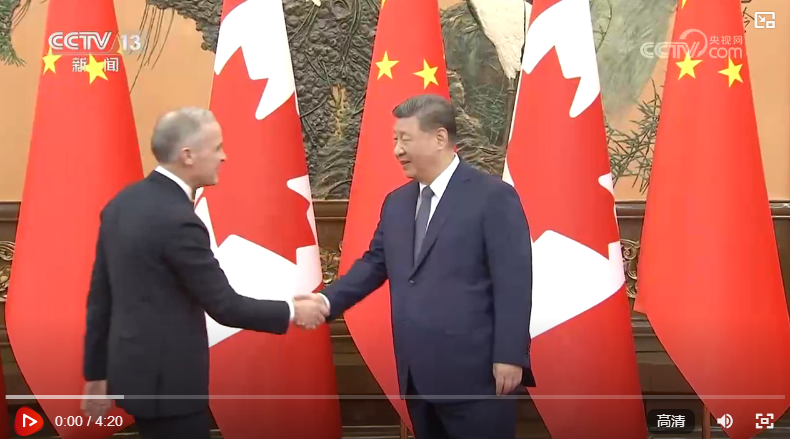 1月16日上午,国家主席习近平在北京人民大会堂会见来华进行正式访问的加拿大总理卡尼。