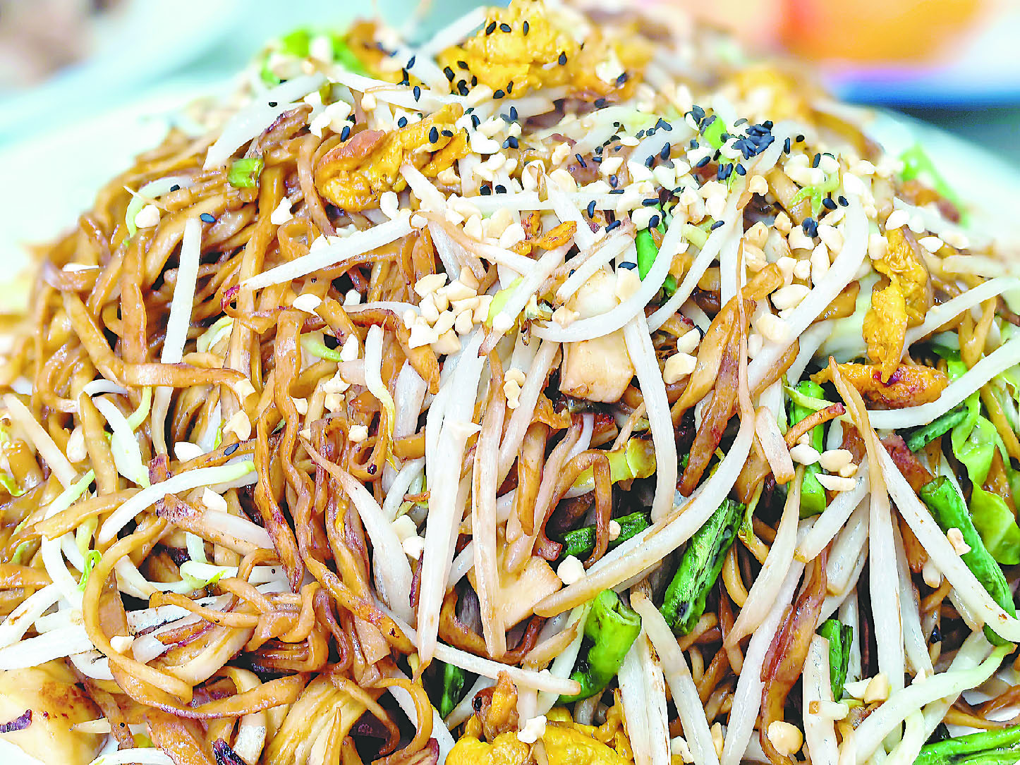 再说店里的炒面,只见那锅和勺在厨师手里上下翻飞,热油中爆起鸡蛋的香气,然后放入葱、姜、蒜、豆角和豆芽。锅里的面起起落落,勺在调味盒内轻点,料随勺起撒进锅里,顿时芳香四溢。最后撒上一些花生碎,一盘炒面在行云流水中上了餐桌。他家的炒面鲜香味美,口感十足。虽然是炒的,但是一点儿不油腻,味道咸淡适中,嚼劲十足,且有鸡蛋的香味。豆角的清爽和豆芽的清脆融合在一起,给炒面增添了不少风味,让整份炒面味道更好。