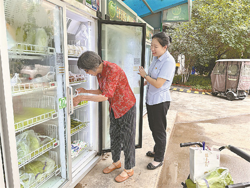 7月12日上午,山阳区定和街道新兴社区太极景润小区物业生鲜蔬菜自动售卖柜前,廉戊霄看到一位上年龄的业主准备取菜,连忙上前帮助。