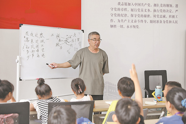 7月22日上午,山阳区艺新街道成丰路社区二楼一间多功能室内,老党员汪洪海站在讲台上,一笔一画教小学生练书法。“老师讲得真好!”“老师免费给孩子们讲书法课,很有奉献精神。”“老党员带着孩子们学书法,满满的正能量。”……门外家长交流的话语间,都是赞赏。