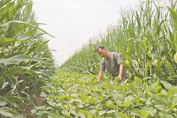 周长胜查看玉米地套种大豆长势情况。宁江东 摄