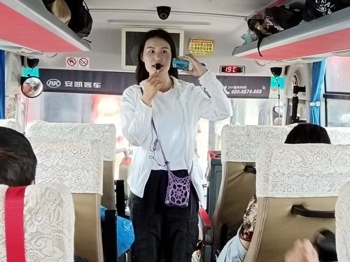 程琳在旅游大巴上为游客讲解。记者 杨景鹏 摄
