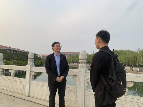 仝兆景(左)在校园里和学生交谈,解答相关问题。记者 朱颖江 摄