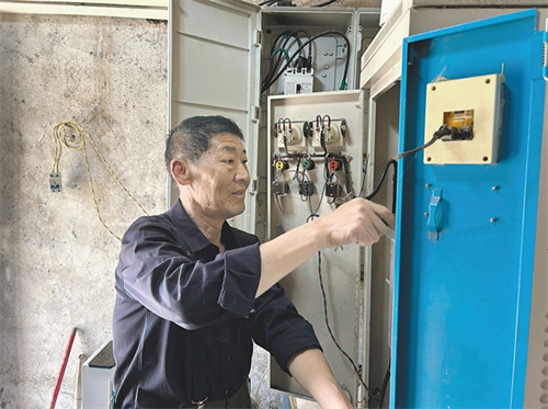 梁保朝在村里维修水泵供电设备。 杜挺勇 摄