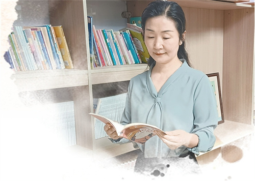 王文霞在学校读书角研读古文。
