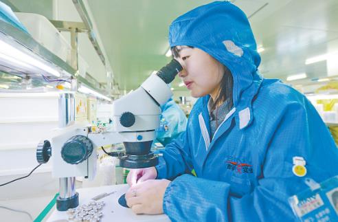 4月25日,位于修武经济技术开发区的鑫宇科技工人在显微镜下生产隔离器。该园区通过产品研发、人才培育、资金注入,孵化、培育一批生产性企业。形成了1200万只适配器、6000万个光元器件的产能,年产1500万只隔离器位于国内同行第一。