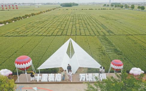 5月8日,游客在温县祥云镇大尚村“十里麦廊”打卡点参观休闲。