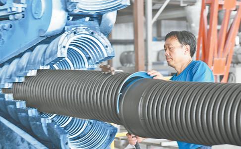 6月5日,河南锦润塑胶科技有限公司工人在生产排水管件。该公司是一家从事工程管材生产的企业。产品广泛应用于城镇供排水、天然气、煤气运输、电气工程等各个领域。该公司经过不断发展壮大,目前,已拥有国内先进的20余条特种管道生产线,年生产能力已达3万吨,年产值已达6000万元。