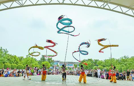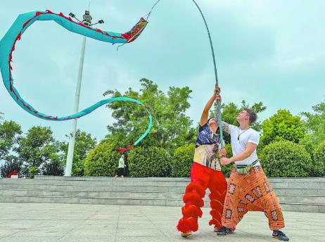 在西陶文化体育公园,外国友人观看了长拳、长枪、太极拳等表演。特别是太极拳表演,表演者动作刚柔并济、行云流水,飘逸的身姿让外国友人竖起大拇指。随后,市级非遗黄河龙狮代表性传承人杨飞龙向外国友人传授“黄河飞龙”技艺,大家跃跃欲试,舞动手中的飞龙。“黄河飞龙”技艺以黄河龙文化为表现特征,在动作编排上以传统舞龙技艺为基础,创新性地加入太极拳等武术动作,生动呈现了中华龙的神韵。